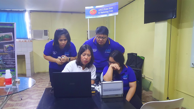 HPPECC officers trying the Quantum Resonance Magnetic Analyzer (QRMA), a high-tech machine that analyzes a person's health through electromagnetic signals in the body. It works by collecting and analyzing the weak magnetic cells in the human body and recommends possible solutions. ANCI Sales and Training Head, Joy Pablito, is seen explaining how the machine works.